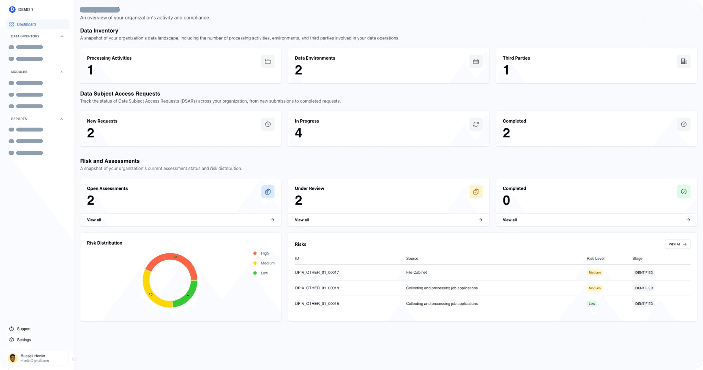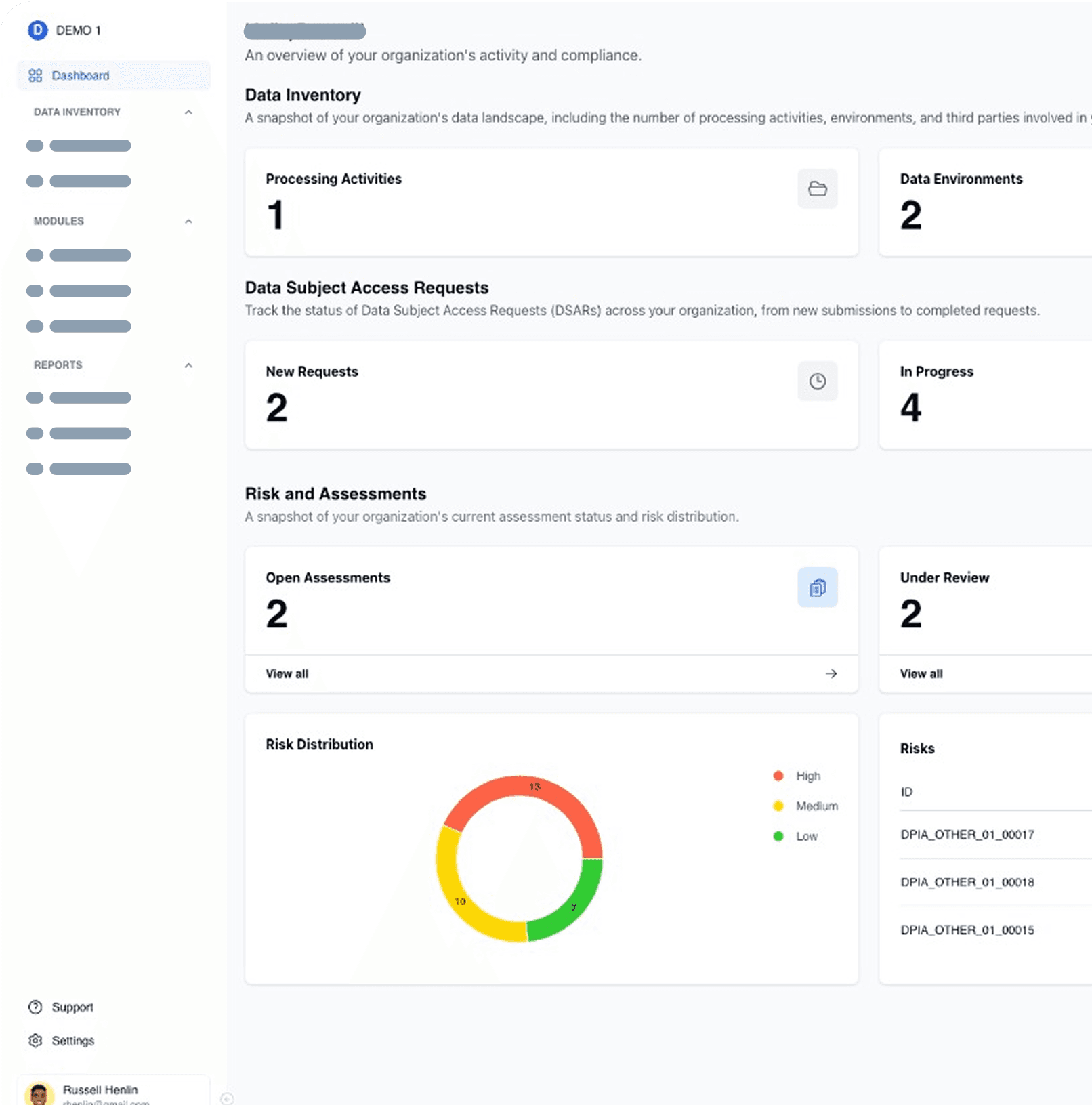Guided PIAs/DPIAs assign risk, while DSAR inbox tracks deadlines and one-click exports do the paperwork for you.